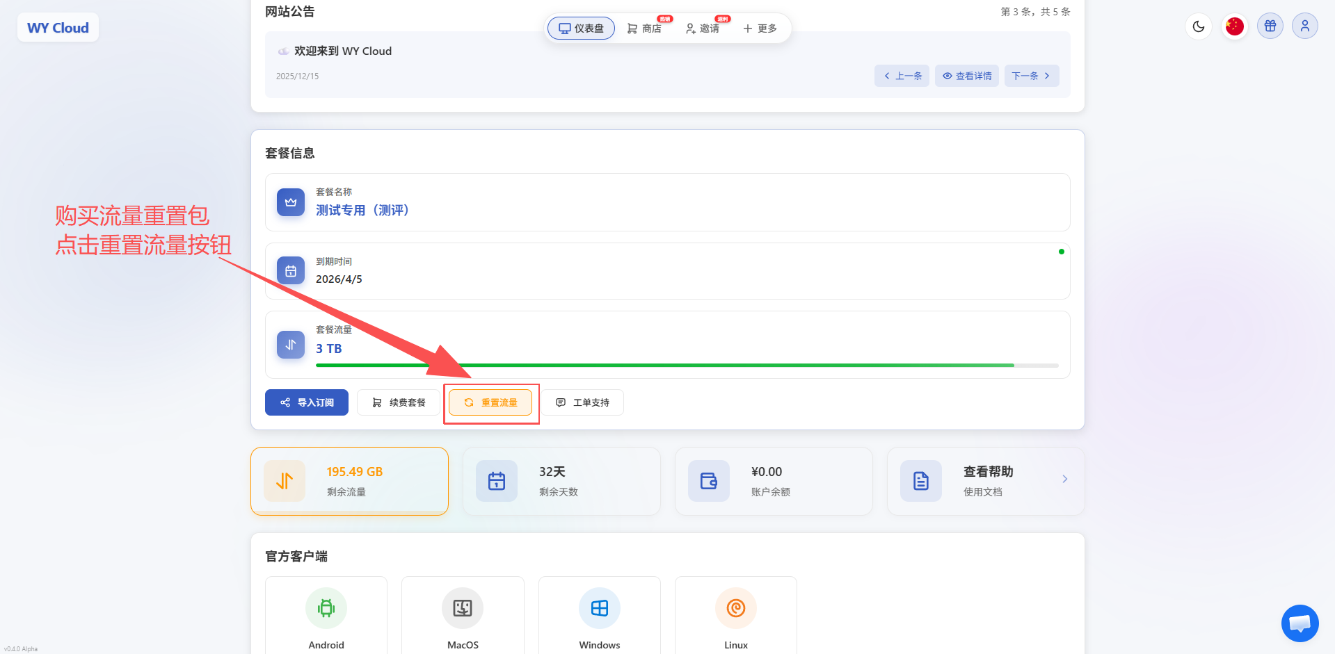变更新订阅后支持 立即重置流量;重新购买 不限时套餐 也会自动重置流量。